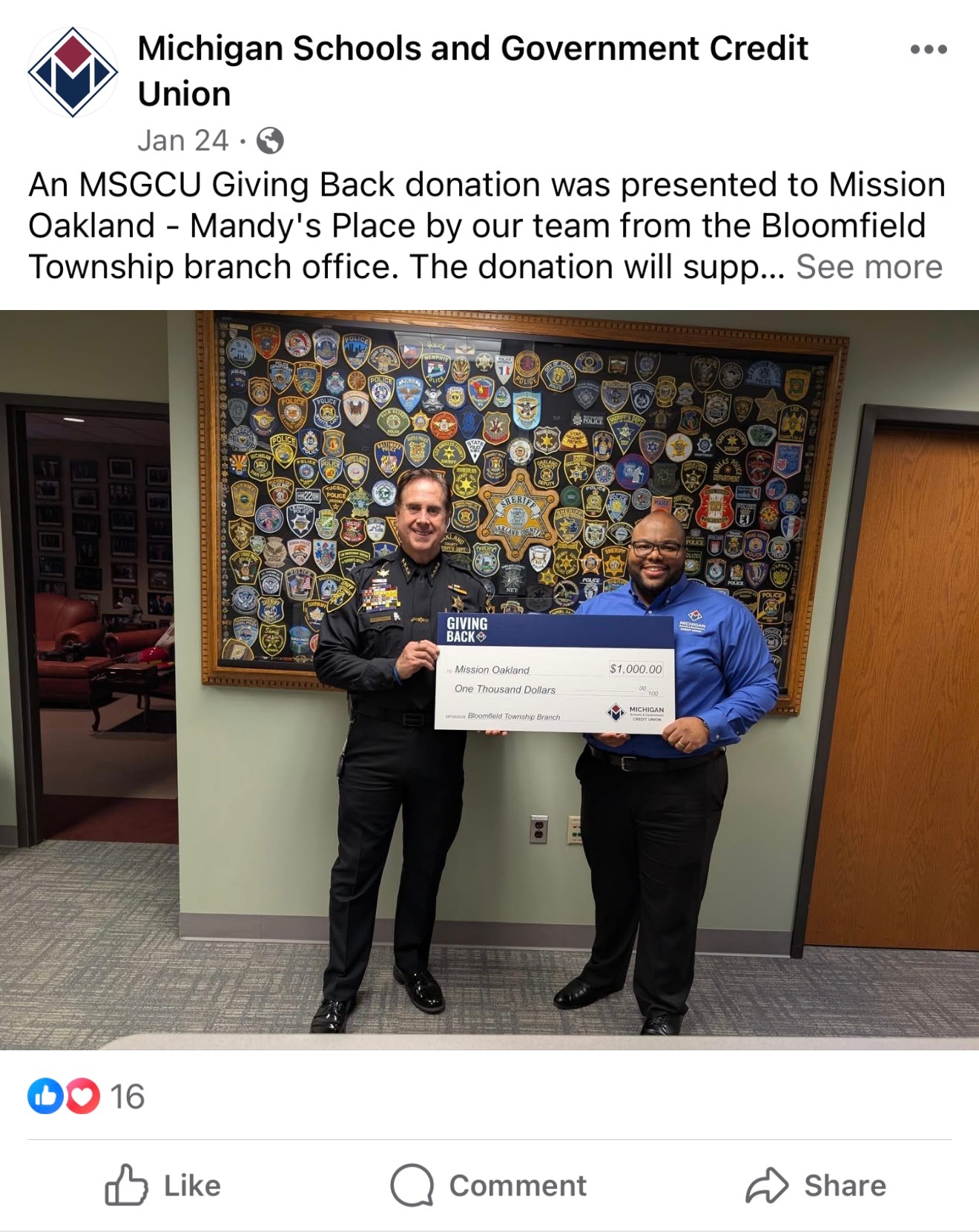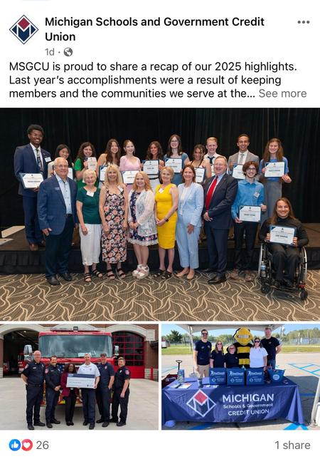 7th February 2026 Community Partnership Highlight – Bloomfield Township Branch Donation Social media post highlighting MSGCU’s community giving efforts and local nonprofit support.