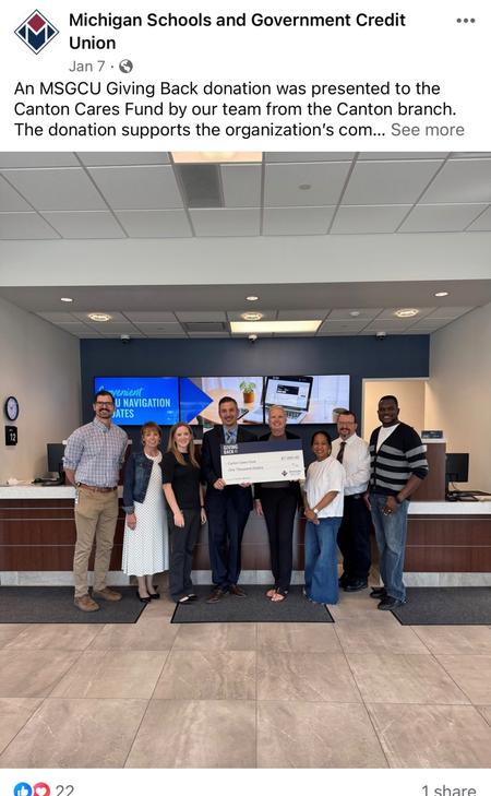 7th February 2026 Community Giving Social Media Post – Canton Branch Donation Social media content highlighting an MSGCU Giving Back donation supporting a local community organization.